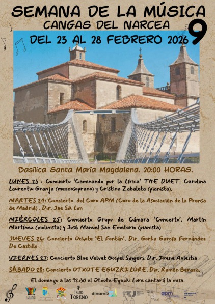 E El 24 de febrero viajamos con una enorme ilusión a Asturias para participar en la ya tradicional Semana Musical de Cangas del Narcea, invitados por la Concejalía de Cultura del Ayuntamiento y con la especialísima atención de su archivera y documentalista, Marta, que nos hizo de guía y consejera durante nuestra estancia. En la Basílica de Santa María Magdalena, cantamos piezas variadas de nuestro repertorio, canciones asturianas y populares de diversos sitios de España, zarzuela, habaneras e incluso mejicanas, dirigidos por el maestro, Jae Sik Lim, con Do Kyung Lim Kim al piano y Gloria Peña, nuestra compañera contralto, al acordeón. Tuvimos una acogida maravillosa, un tiempo estupendo y disfrutamos dos comidas y una cena dignas de recordar.
