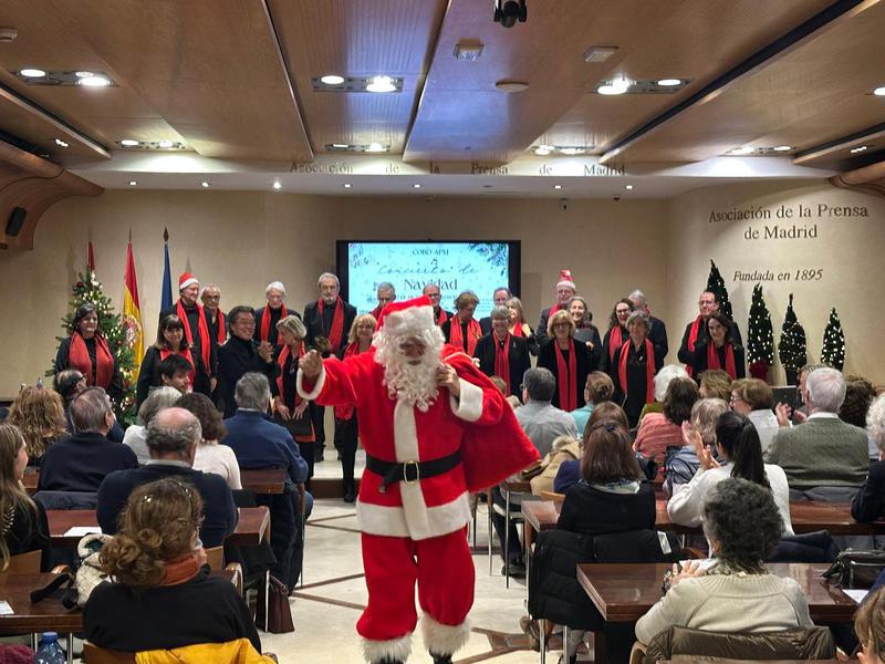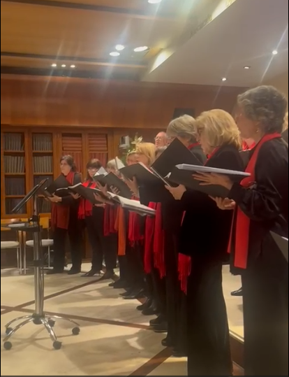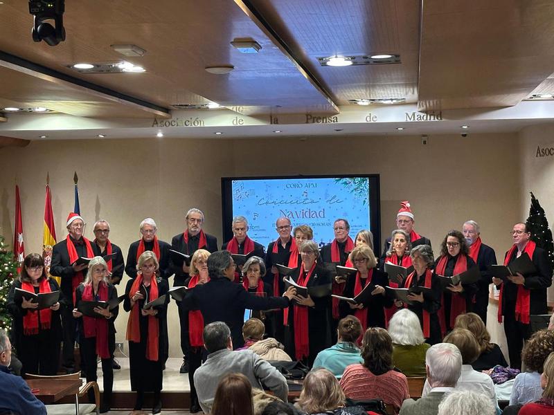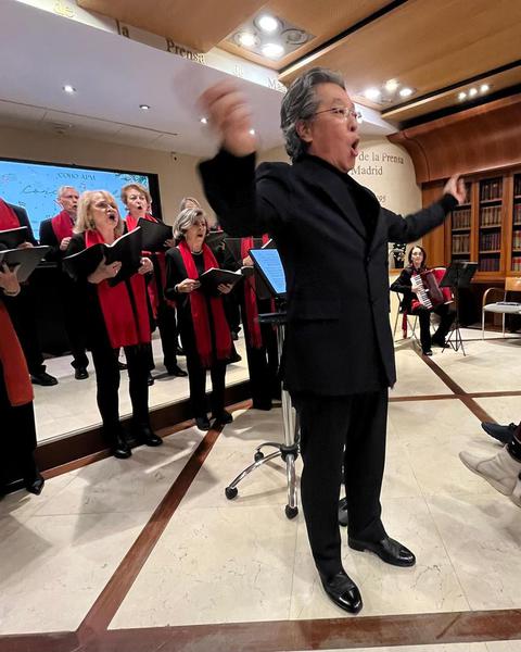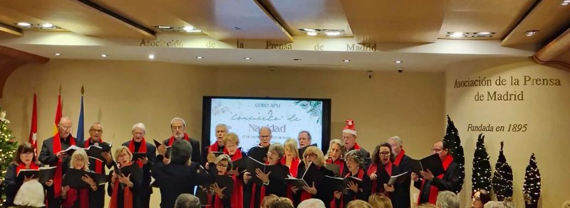 Acabamos el 2025 con bastante actividad en Navidad. Al tradicional Concierto de Villancicos en la sede de la Asociación de la Prensa de Madrid unimos otro, también con interpretaciones de canciones navideñas, en la Casa de Vacas de Madrid, invitados por la Asociación de Amigos de los Jardines del Buen Retiro. Fueron dos veladas festivas y muy entrañables. Como es tradicional, nuestro director JaeSik Lim invitó a todos los asistentes a cantar con el Coro la conocida pieza navideña Adeste Fideles. Nuestra compañera Gloria Peña nos acompañó con su acordeón en muchas de las canciones. Y todas las aprendimos gracias al trabajo de nuestra profesora de Canto y soprano, Chus García Casado.